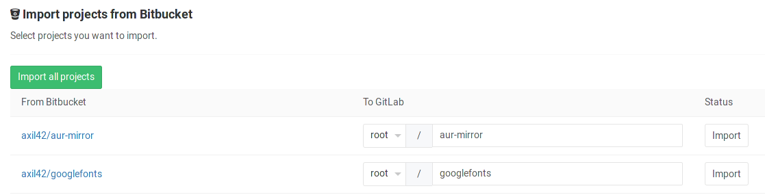 Note: The Bitbucket integration must be first enabled in order to be able to import your projects from Bitbucket. Ask your GitLab administrator to enable this if not already.