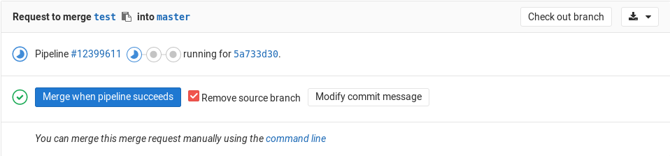 When the pipeline succeeds, the merge request will automatically be merged. When the pipeline fails, the author gets a chance to retry any failed jobs, or to push new commits to fix the failure.
